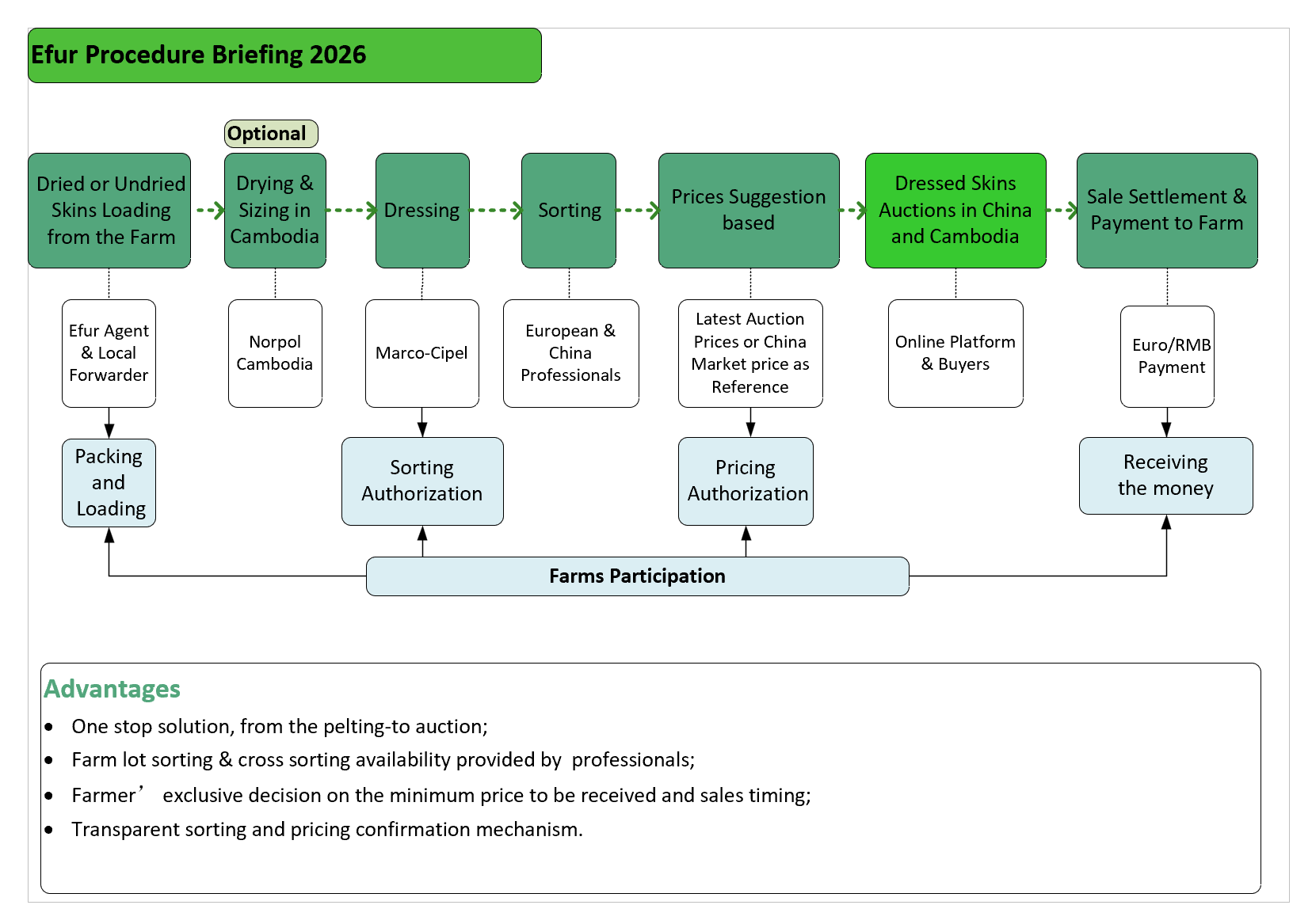 Dressing Cost & Transportation Fee Payable | ● Buyers will bear all the costs if the skins are sold within nine months from the date when the first price suggestion is given to the farms. ● If the skins are not sold within nine months, the farms are required to pay for the transportation, drying, and dressing costs first. Efur will reimburse these costs if the skins are sold later |